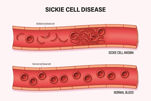Sickle cell disease is an inherited blood condition that affects the shape and function of red blood cells. Instead of being soft and round, these cells can become rigid and C-shaped, making it harder for them to move smoothly through blood vessels. As a result, blood flow may be reduced, and oxygen delivery to tissues can be affected.